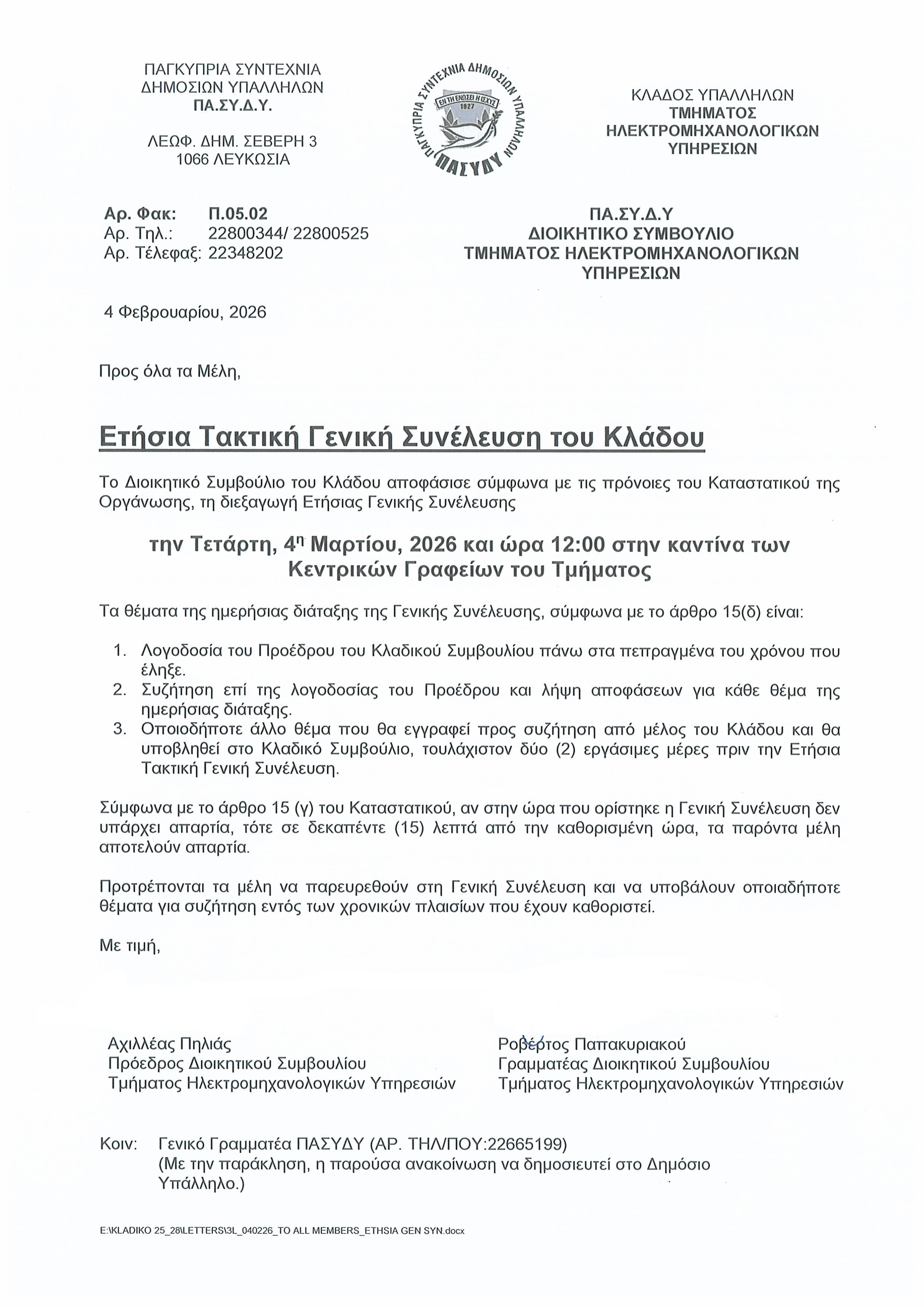 2/19/2026 Ετήσια Γενική Συνέλευση Κλάδου Υπαλλήλων Τμήματος Ηλεκτρομηχανολογικών Υπηρεσιών Τελευταία Νέα 3/13/2026 Διάλεξη με θέμα Τρίτη Ηλικία: Διατροφή και Άσκηση για καλύτερη ποιοτική ζωή 2/13/2026 Καταχώριση αίτησης στο Ανώτατο Δικαστήριο για ακύρωση της απόφασης του Αρχηγού Αστυνομίας αναφορικά με το ωράριο 2/10/2026 Ομαδικό Σχέδιο Ασφάλισης Ζωής ΠΑ.ΣΥ.Δ.Υ. 2/3/2026 Ετήσιες Τακτικές Γενικές Συνελεύσεις Κλάδων και Επαρχιακών Τμημάτων 1/30/2026 Η ΠΑΣΥΔΥ χαιρετίζει την αποκατάσταση από τη Βουλή του δικαιώματος σε ιατροφαρμακευτική περίθαλψη για τους δημοσίους υπαλλήλους Τα νέα του Κλάδου Συνταξιούχων ΠΑ.ΣΥ.Δ.Υ. Μεταρρύθμιση της Δ.Υ. Νέο Σχέδιο Συνταξιοδοτικών Ωφελημάτων-Εγχειρίδιο Εξοχικά Διαμερίσματα ΠΑ.ΣΥ.Δ.Υ.-Κρατήσεις