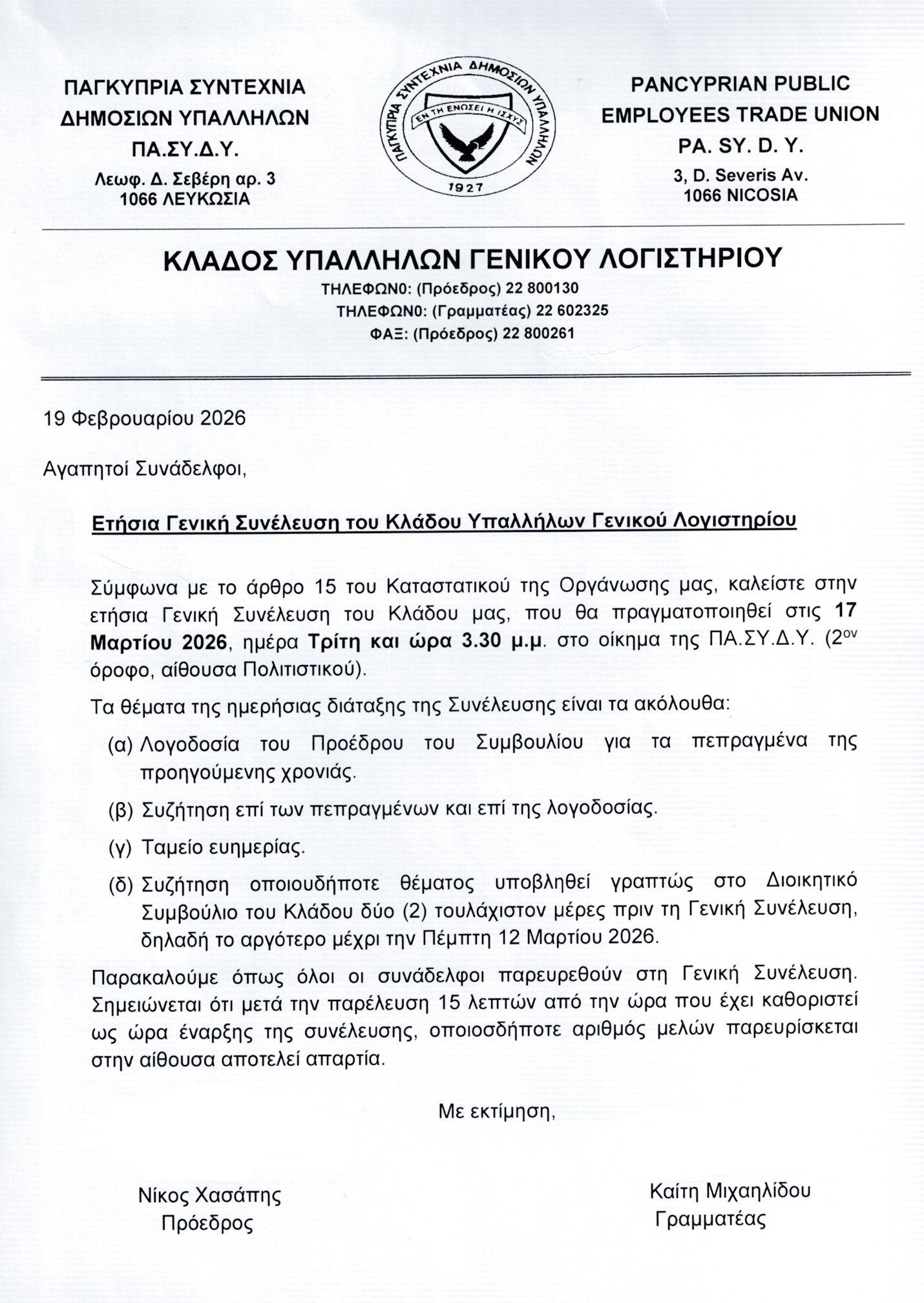 2/26/2026 Ετήσια Γενική Συνέλευση Κλάδου Υπαλλήλων Γενικού Λογιστηρίου Τελευταία Νέα 3/13/2026 Διάλεξη με θέμα Τρίτη Ηλικία: Διατροφή και Άσκηση για καλύτερη ποιοτική ζωή 2/13/2026 Καταχώριση αίτησης στο Ανώτατο Δικαστήριο για ακύρωση της απόφασης του Αρχηγού Αστυνομίας αναφορικά με το ωράριο 2/10/2026 Ομαδικό Σχέδιο Ασφάλισης Ζωής ΠΑ.ΣΥ.Δ.Υ. 2/3/2026 Ετήσιες Τακτικές Γενικές Συνελεύσεις Κλάδων και Επαρχιακών Τμημάτων 1/30/2026 Η ΠΑΣΥΔΥ χαιρετίζει την αποκατάσταση από τη Βουλή του δικαιώματος σε ιατροφαρμακευτική περίθαλψη για τους δημοσίους υπαλλήλους Τα νέα του Κλάδου Συνταξιούχων ΠΑ.ΣΥ.Δ.Υ. Μεταρρύθμιση της Δ.Υ. Νέο Σχέδιο Συνταξιοδοτικών Ωφελημάτων-Εγχειρίδιο Εξοχικά Διαμερίσματα ΠΑ.ΣΥ.Δ.Υ.-Κρατήσεις