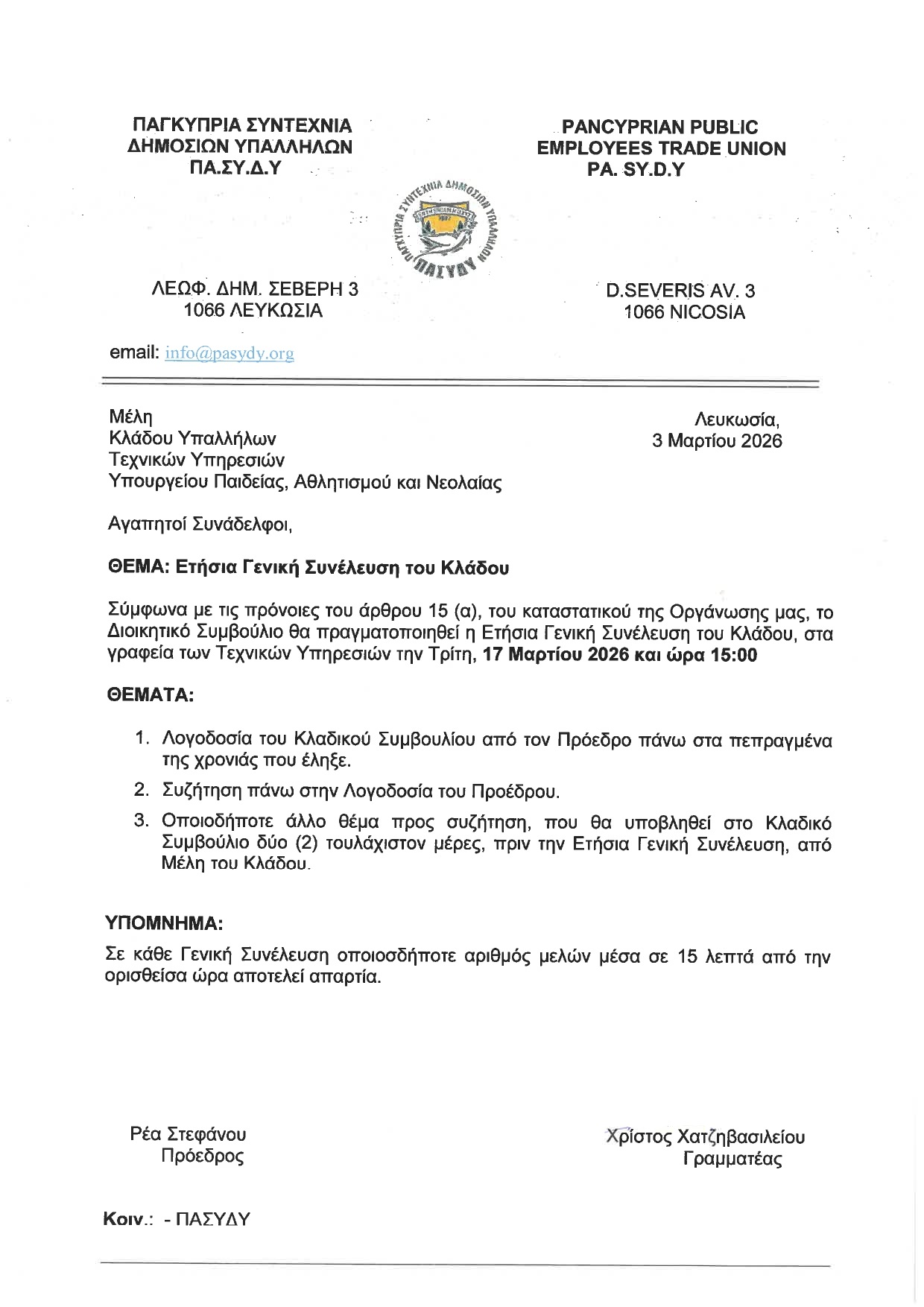 3/3/2026 Ετήσια Γενική Συνέλευση Κλάδου Υπαλλήλων Τεχνικών Υπηρεσιών Υπουργείου Παιδείας Τελευταία Νέα 3/20/2026 Ενημέρωση για το Ομαδικό Σχέδιο Ασφάλισης ΠΑΣΥΔΥ και τις νέες πρόνοιες για τη Φορολόγηση Φυσικών Προσώπων 3/9/2026 Εκδήλωση ΠΑΣΥΔΥ για την Παγκόσμια Μέρα της Γυναίκας 3/9/2026 Ανακοίνωση: Οι Κτηνιατρικές Υπηρεσίες τηρούν πρωτόκολλα 2/10/2026 Ομαδικό Σχέδιο Ασφάλισης Ζωής ΠΑ.ΣΥ.Δ.Υ. 2/3/2026 Ετήσιες Τακτικές Γενικές Συνελεύσεις Κλάδων και Επαρχιακών Τμημάτων Τα νέα του Κλάδου Συνταξιούχων ΠΑ.ΣΥ.Δ.Υ. Μεταρρύθμιση της Δ.Υ. Νέο Σχέδιο Συνταξιοδοτικών Ωφελημάτων-Εγχειρίδιο Εξοχικά Διαμερίσματα ΠΑ.ΣΥ.Δ.Υ.-Κρατήσεις