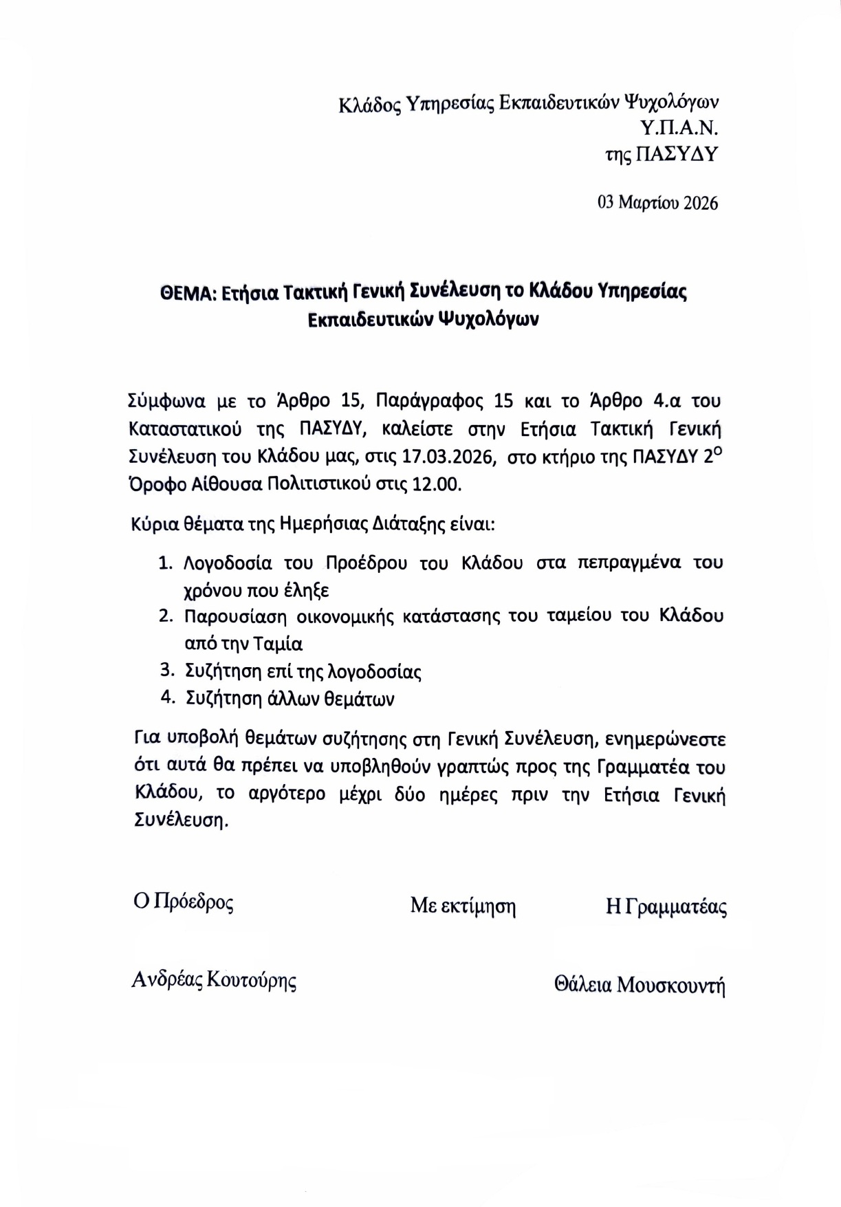3/3/2026 Ετήσια Γενική Συνέλευση Κλάδου Υπηρεσίας Εκπαιδευτικών Ψυχολόγων Υπουργείου Παιδείας Τελευταία Νέα 3/20/2026 Ενημέρωση για το Ομαδικό Σχέδιο Ασφάλισης ΠΑΣΥΔΥ και τις νέες πρόνοιες για τη Φορολόγηση Φυσικών Προσώπων 3/9/2026 Εκδήλωση ΠΑΣΥΔΥ για την Παγκόσμια Μέρα της Γυναίκας 3/9/2026 Ανακοίνωση: Οι Κτηνιατρικές Υπηρεσίες τηρούν πρωτόκολλα 2/10/2026 Ομαδικό Σχέδιο Ασφάλισης Ζωής ΠΑ.ΣΥ.Δ.Υ. 2/3/2026 Ετήσιες Τακτικές Γενικές Συνελεύσεις Κλάδων και Επαρχιακών Τμημάτων Τα νέα του Κλάδου Συνταξιούχων ΠΑ.ΣΥ.Δ.Υ. Μεταρρύθμιση της Δ.Υ. Νέο Σχέδιο Συνταξιοδοτικών Ωφελημάτων-Εγχειρίδιο Εξοχικά Διαμερίσματα ΠΑ.ΣΥ.Δ.Υ.-Κρατήσεις