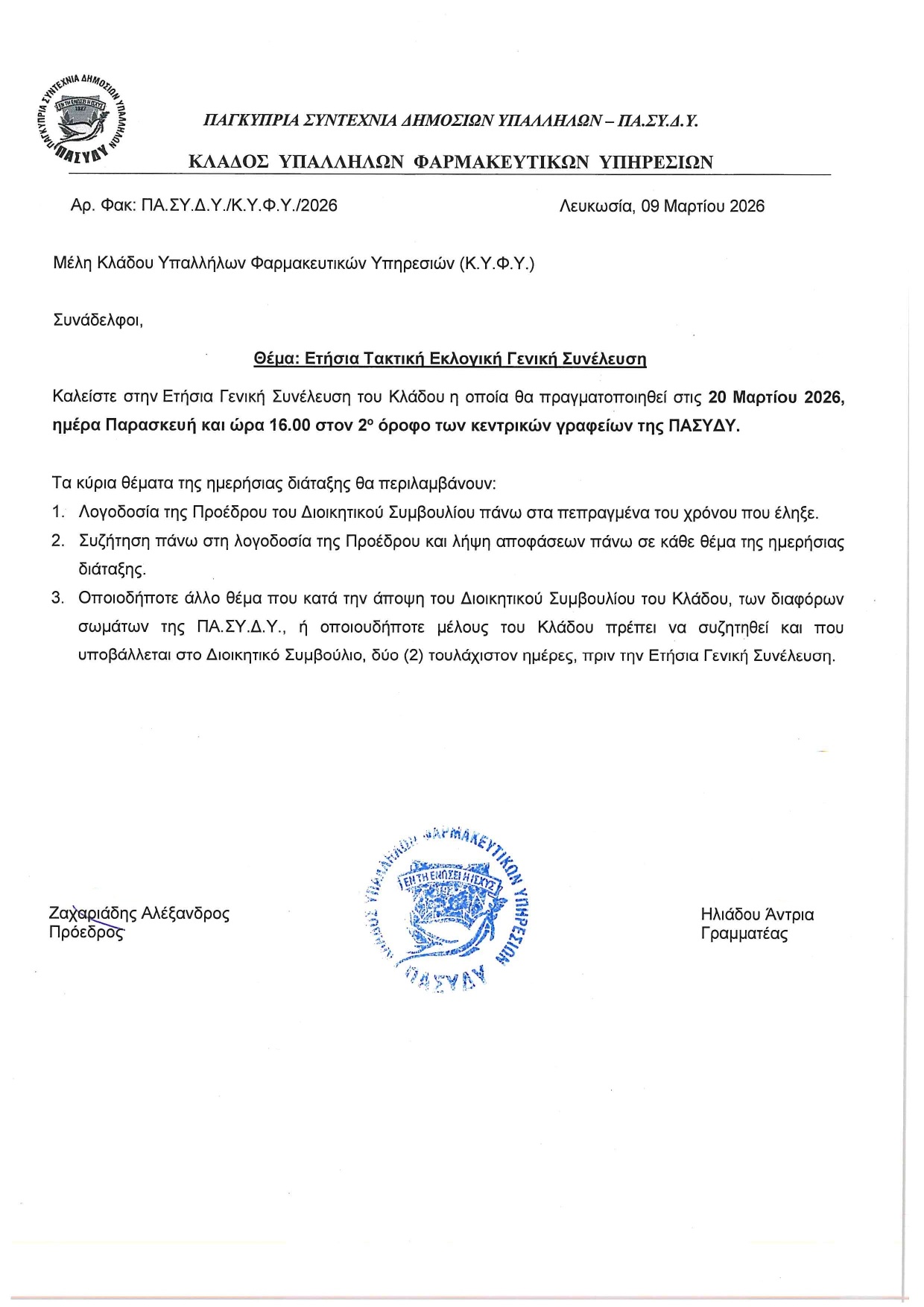 3/9/2026 Ετήσια Τακτική Γενική Συνέλευση Κλάδου Υπαλλήλων Φαρμακευτικών Υπηρεσιών Τελευταία Νέα 3/20/2026 Ενημέρωση για το Ομαδικό Σχέδιο Ασφάλισης ΠΑΣΥΔΥ και τις νέες πρόνοιες για τη Φορολόγηση Φυσικών Προσώπων 3/9/2026 Εκδήλωση ΠΑΣΥΔΥ για την Παγκόσμια Μέρα της Γυναίκας 3/9/2026 Ανακοίνωση: Οι Κτηνιατρικές Υπηρεσίες τηρούν πρωτόκολλα 2/10/2026 Ομαδικό Σχέδιο Ασφάλισης Ζωής ΠΑ.ΣΥ.Δ.Υ. 2/3/2026 Ετήσιες Τακτικές Γενικές Συνελεύσεις Κλάδων και Επαρχιακών Τμημάτων Τα νέα του Κλάδου Συνταξιούχων ΠΑ.ΣΥ.Δ.Υ. Μεταρρύθμιση της Δ.Υ. Νέο Σχέδιο Συνταξιοδοτικών Ωφελημάτων-Εγχειρίδιο Εξοχικά Διαμερίσματα ΠΑ.ΣΥ.Δ.Υ.-Κρατήσεις